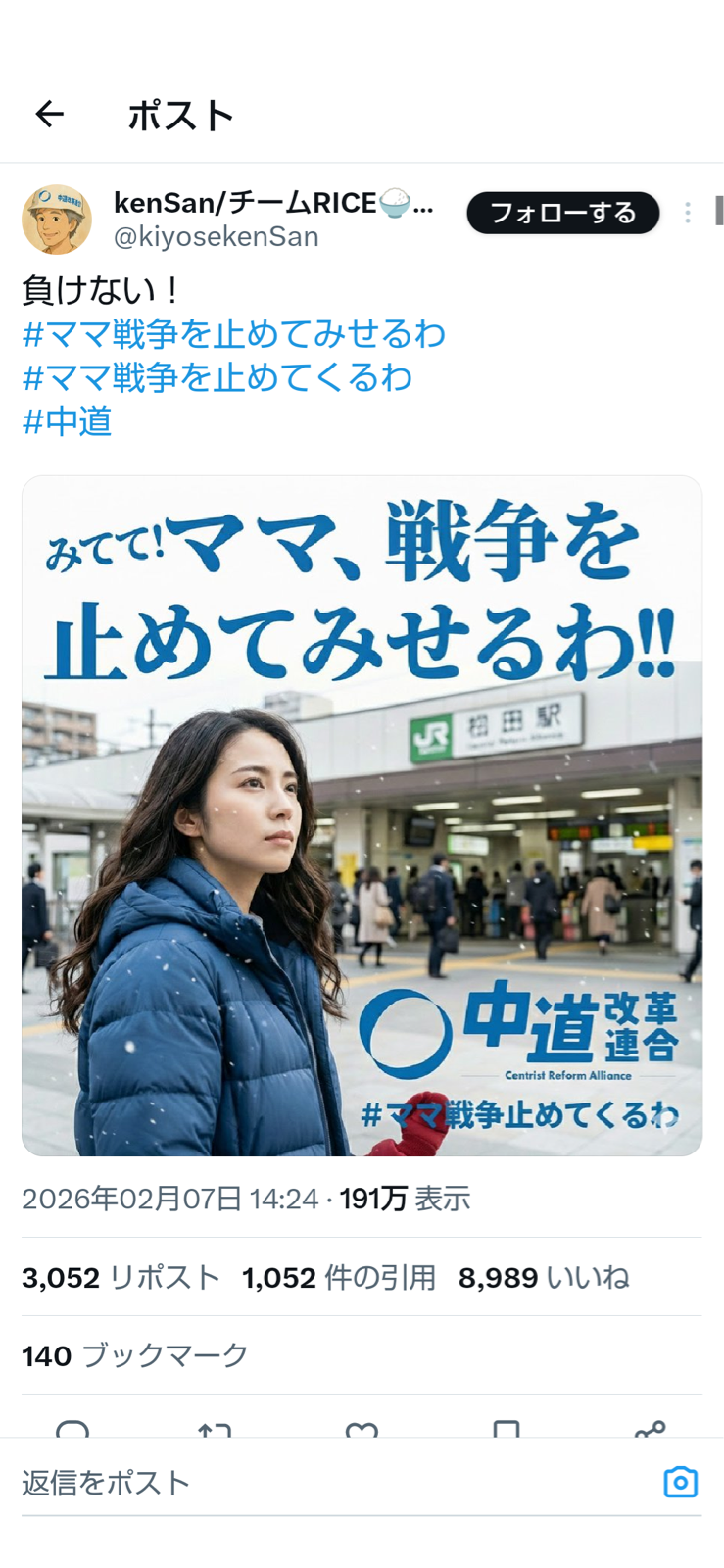 政権の防衛力強化の方針や今回の選挙結果によっては憲法改正の可能性が出てくることを懸念する声の高まりから「#ママ戦争止めてくるわ」のハッシュタグがXの政治分野でトレンド1位になり、有名人からも「戦争反対」の声があがるなど大きな反響を呼んでいる。